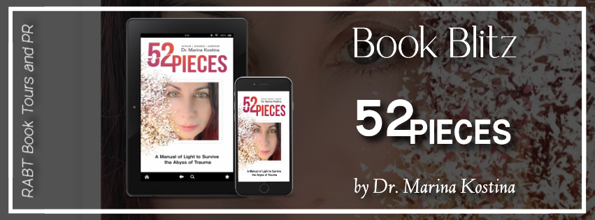 52 Pieces: A Manual of Light to Survive the Abyss of Trauma is based on Dr. Marina Kostina's near-death sky-diving accident and her miraculous journey back to life. Dr. Kostina's body and face were broken into 52 pieces, and it took 10 surgeries to put her back together. The book details author's personal struggle with PTSD, depression, and anxiety through the abyss of her tragedy.